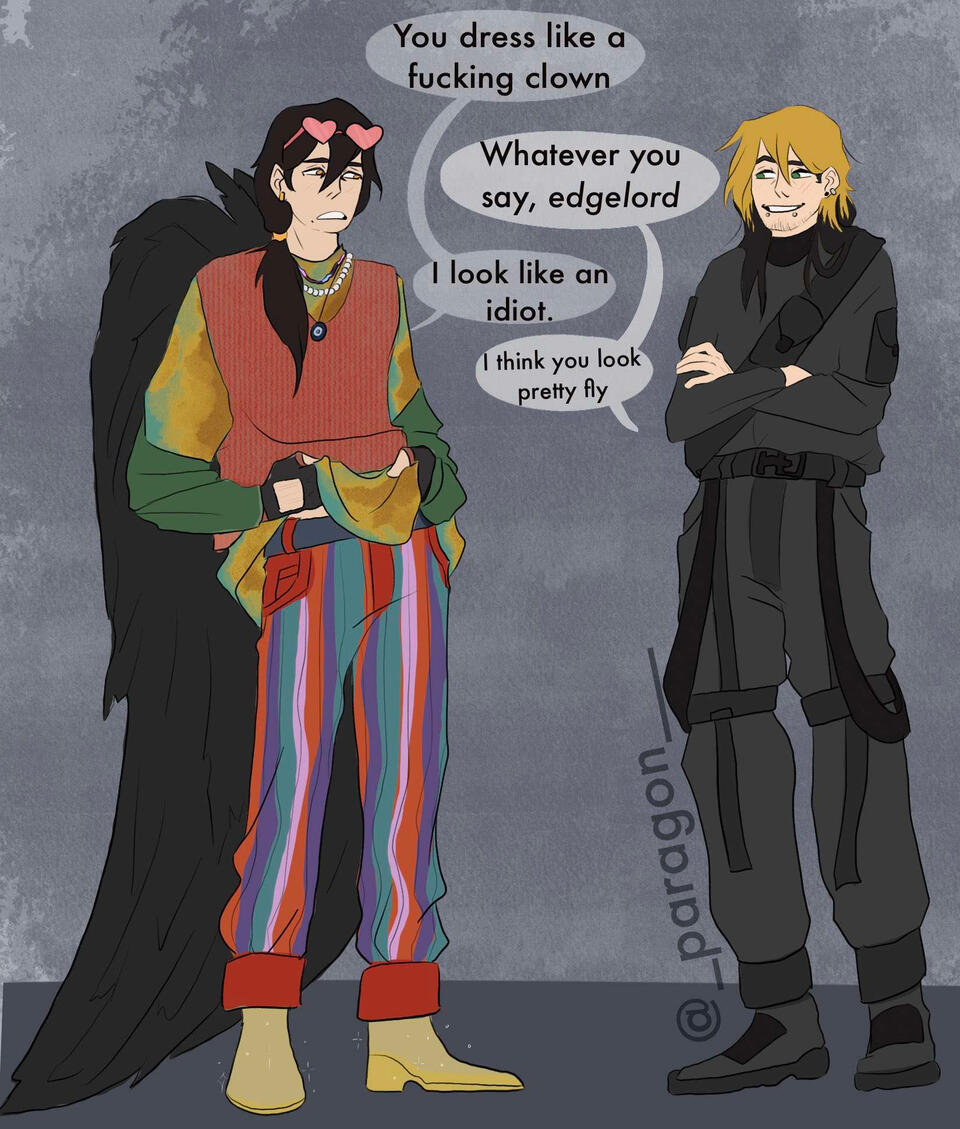 Hayato’s clothing style can best be described as baggy, dark clothing that are either plain or have graphics on it with bands he likes such as Pierce the Veil or Bring Me to the Horizon. His baggy clothing hides his skinny build but it’s also for comfort.He usually sticks to shades rather than color, so you’ll usually catch him wearing black, gray or white. If he does wear color, he’ll wear red (which is his favorite after black) or beige or brown (not his fav but just variety for color). He likes his colors on the dark side.Because of his wings, all of his shirts have two slits in the back where his wings cone out of. There’s no trouble putting his clothing on because his feathers can fly away from his body. He simply sends them away for a moment, puts his shirt on and send them right back. However this does mean his shirts either have to be cut or custom made.