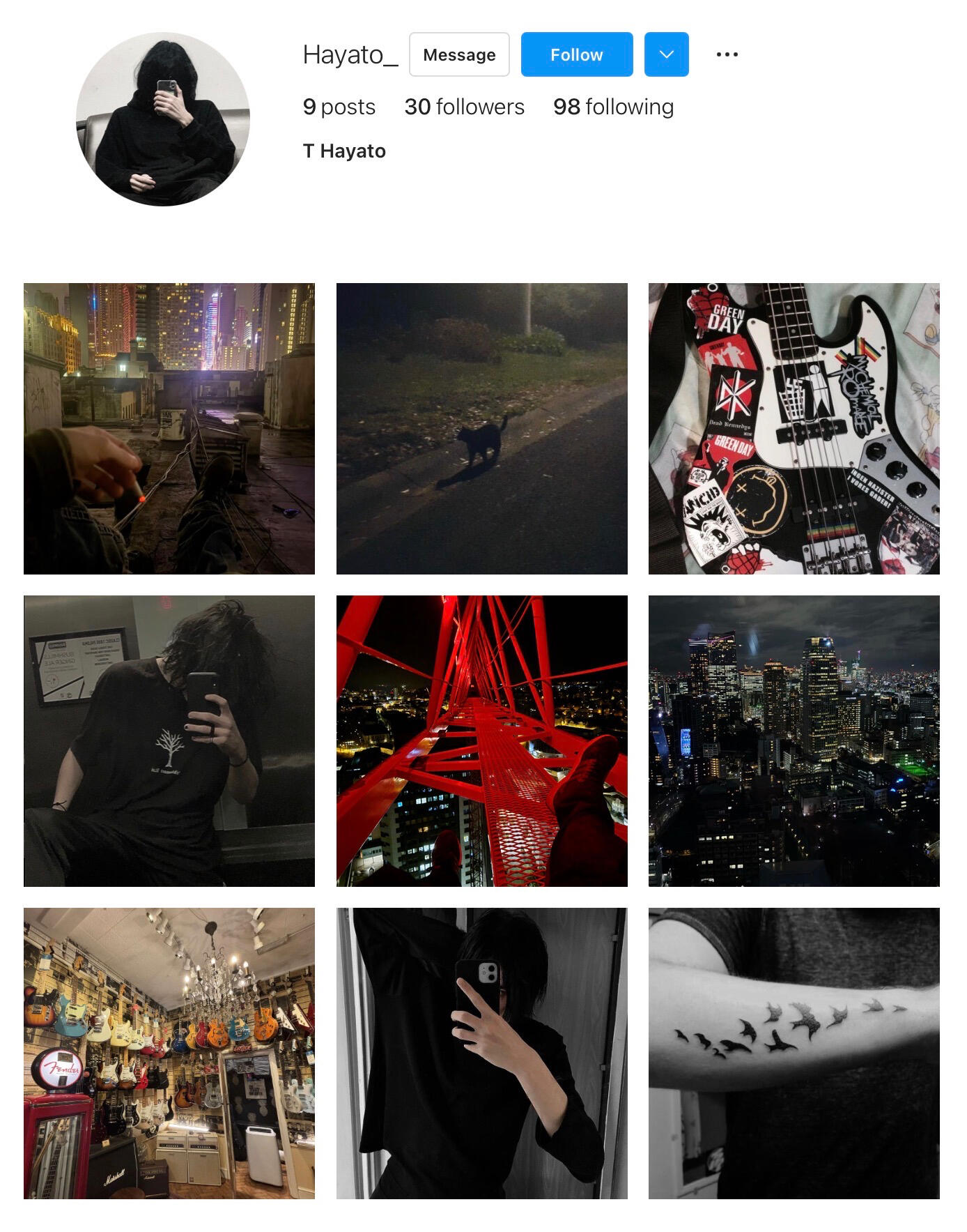 Hayato is someone who barely uses instagram and only has it because his friend Titus insisted he get one. The original thought was that he had less photos, but I wanted the grid to be full so I added more photos.Hayato doesn’t show his face on IG, which explains all the mirror selfies. He doesn’t really care for photos of himself but occasionally he’ll feel like posting these.What he will post more photos of is the city landscape at night or things he likes/finds cool such as his guitar, a random cat or other miscellaneous things. He also has a photo of his tattoo up. These photos have a lot of time in between from when he posts them.Also feel free to either imagine the wings there or that he sends them away for the photos.
