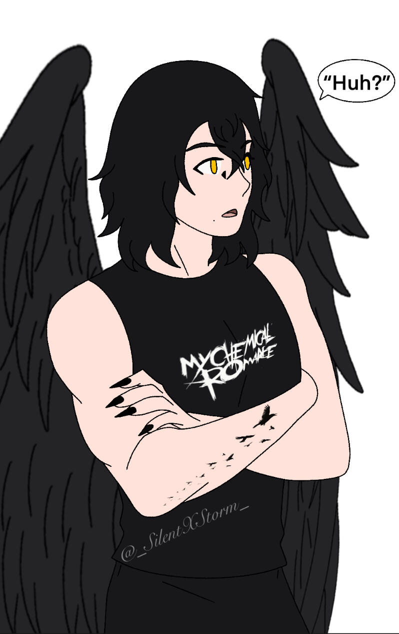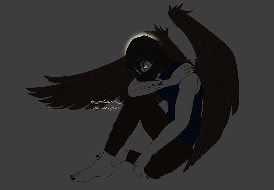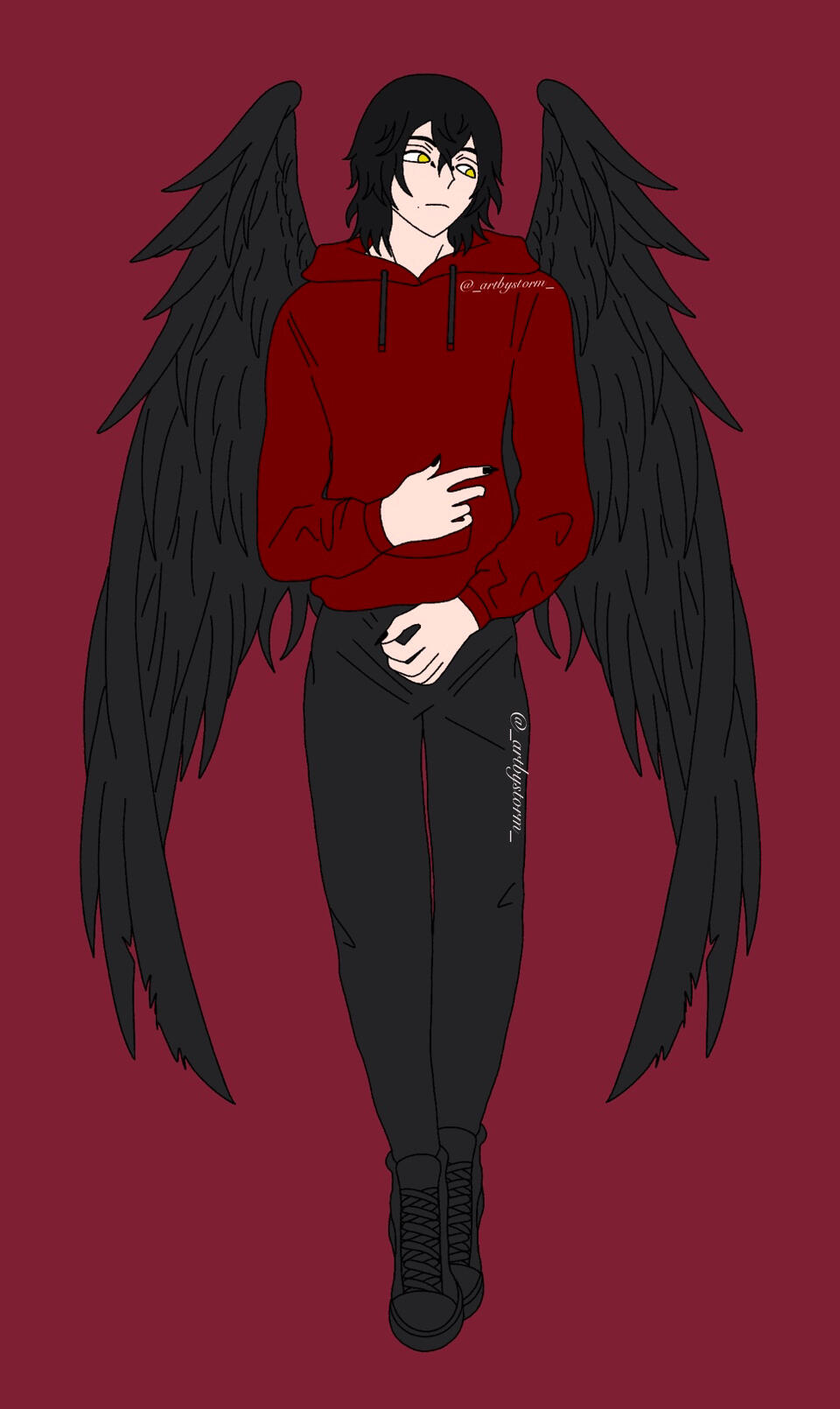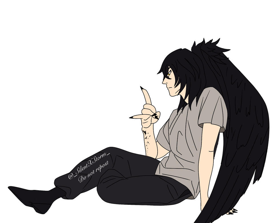 Hayato can best be described as someone who is quiet and mysterious. He is a tough person to crack due to the walls he’s built around himself, so his vulnerability is not easy to see. He keeps his thoughts to himself since he is a private person and doesn’t trust easily. He also doesn’t like being the center of attention.He won’t mess with anyone unless provoked but even that doesn’t get far. He has mastered what is called a “death stare” where he glares at anyone who tests him intensely. The look alone is enough to get people to rethink their choices. If he does speak, his words are sharp and cut deep. While he did get into a lot of physical fights as a kid, he tries to avoid it as an adult.Although he does not like his wings touched, this also extends to the rest of his body. This changes slightly when Akio is around since Akio can be very hands on. This was a problem at first but Hayato adjusted slightly. He simply sends all his feathers away or move his wings if Akio insists on being close. His best friend Titus is the same way but he knows Hayato better than Akio to really over do it (sometimes he does forget though).MENTAL ILLNESS:Hayato has depression and has moments where he gets lost in it. He will seclude himself from everyone for days at a time without care. This either involves him being confined to his room while sleeping in complete darkness or he’ll leave his home. He can usually be found on the rooftops of skyscrapers overlooking the city. It’s the one place no one will disturb him. I wouldn’t say he’s an anxious person overall but anxiety does show when his true quirk is involved.He is no longer suicidal as he was as a teenager but the thoughts do come back sometimes. He has only attempted twice.He does have scars on his arm (one long one on each arm), I just haven’t drawn them. He mostly keeps his arms covered unless it’s too hot and he has a short sleeved shirt on or is shirtless. Titus knows about this incident but Akio does not. He does not share that information with him since he deems it not necessary. The scars speak for themselves.FEAR:Hayato’s worst fear is accidentally killing someone or hurting someone badly with his decay quirk. It is the reason why he does not like anyone touching him. It is the easiest way to piss him off but the true feeling is not anger but fear. However he still craves physical touch, which is why he adjusted slightly to Akio’s needs to be all up on him (like a cat, quite literally). It was very strange to be touched at first and his uncomfort was visible but it’s a work in progress.His usual go to if someone is getting too close is his death stare or to move away but if he has to speak he’ll just say “Don’t touch me” or “Don’t touch my wings”.To make matters worse, only Titus knows about Hayato’s true quirk. Akio does not. He learns about this later.