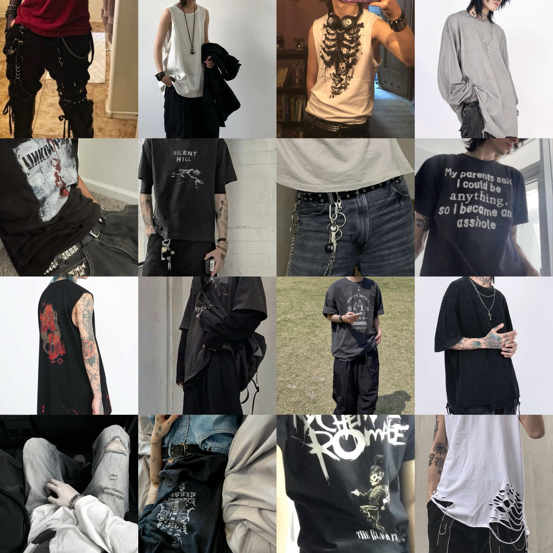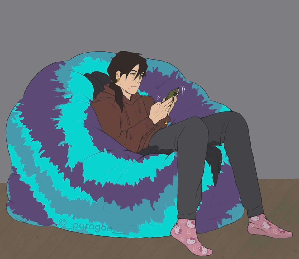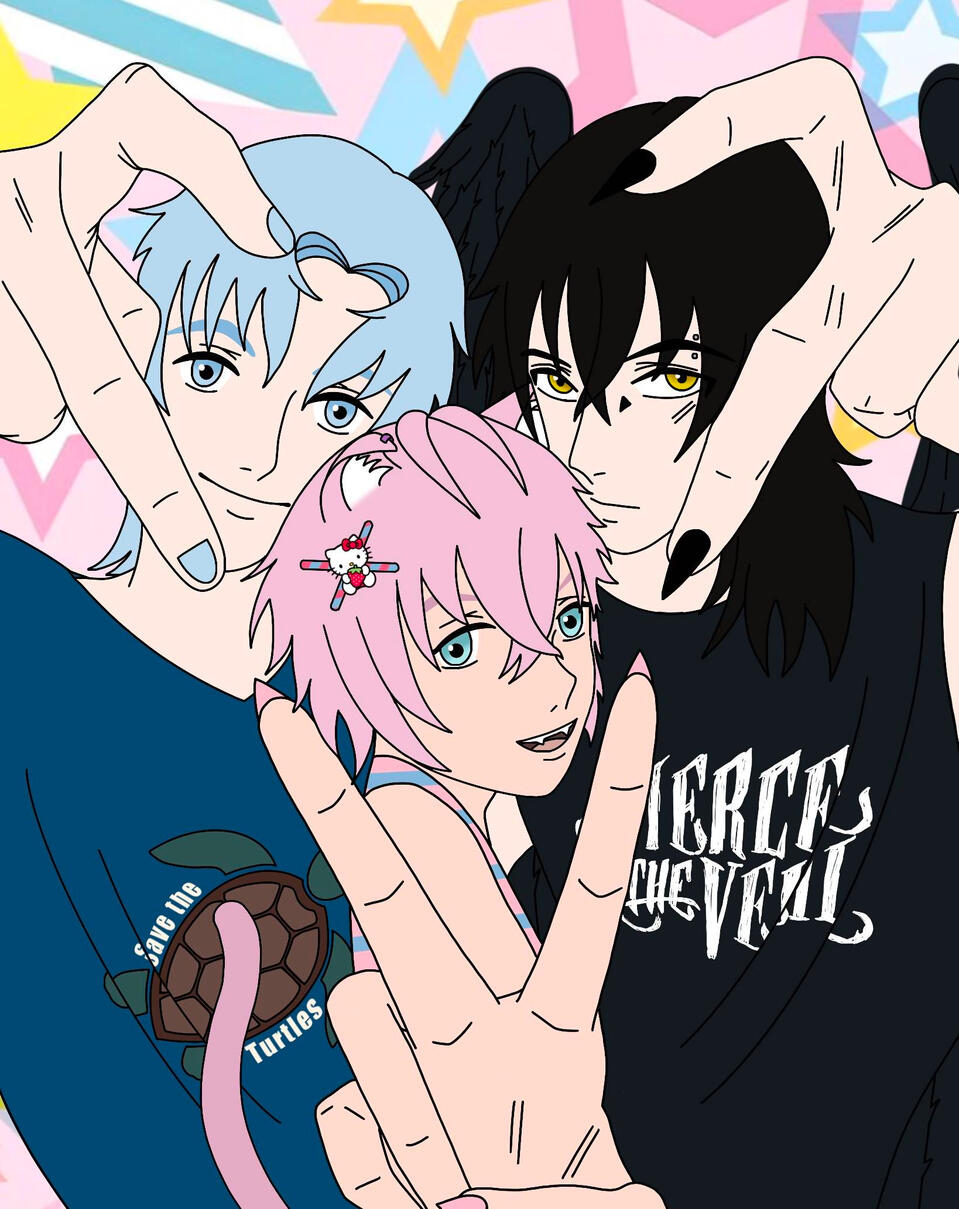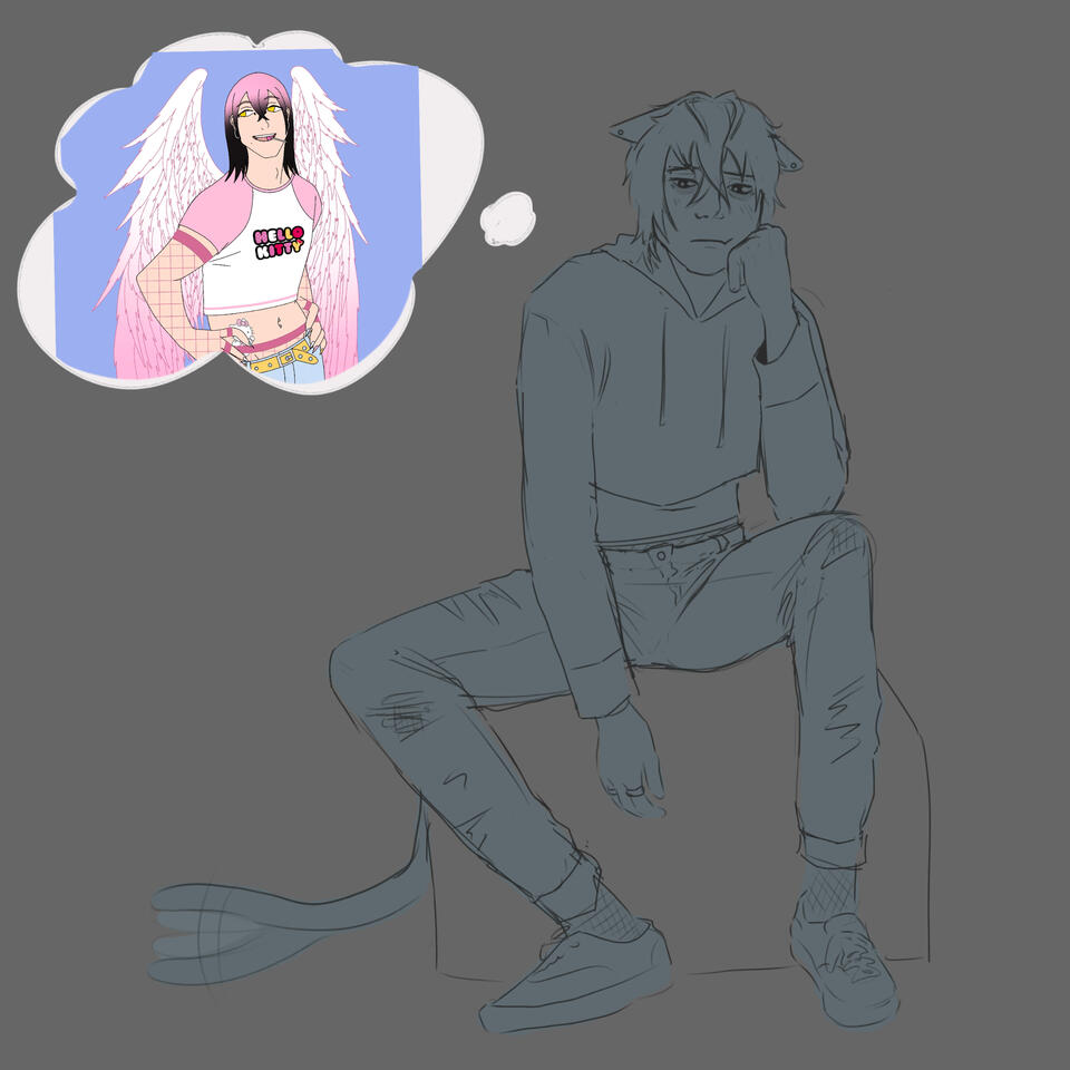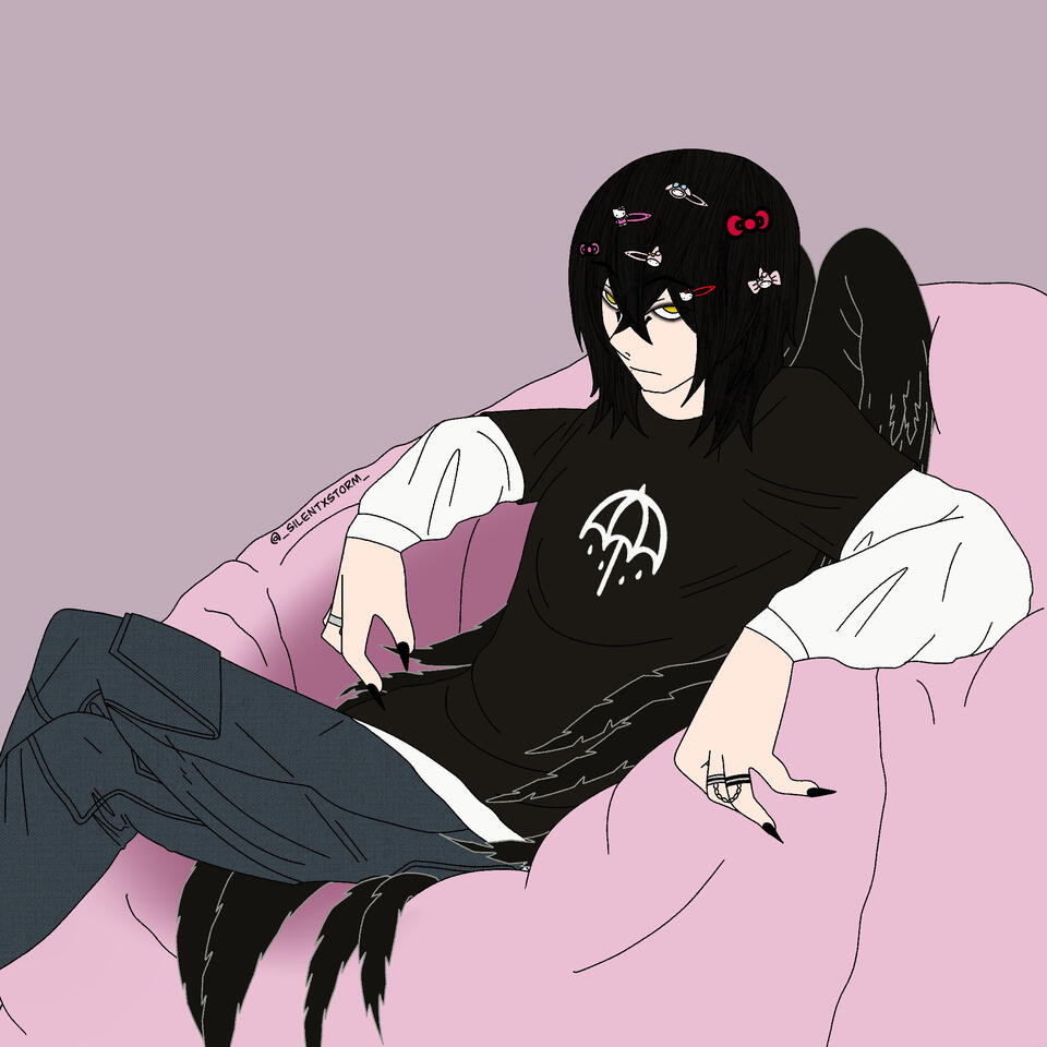 Hayato’s clothing style can best be described as baggy, dark clothing that are either plain or have graphics on it with bands he likes such as Pierce the Veil or Bring Me to the Horizon. His baggy clothing hides his skinny build but it’s also for comfort.He usually sticks to shades rather than color, so you’ll usually catch him wearing black, gray or white. If he does wear color, he’ll wear red (which is his favorite after black) or beige or brown (not his fav but just variety for color). He likes his colors on the dark side.Because of his wings, all of his shirts have two slits in the back where his wings cone out of. There’s no trouble putting his clothing on because his feathers can fly away from his body. He simply sends them away for a moment, puts his shirt on and send them right back. However this does mean his shirts either have to be cut or custom made.