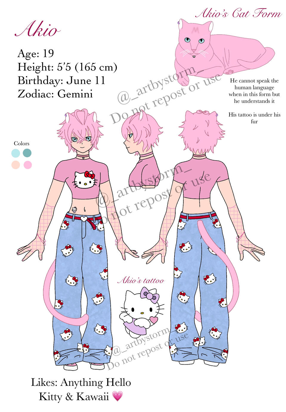 Akio has the ability to shapeshift into an actual cat. Here’s how it works:When in human form, he retains his cat ears and tail. He has very good eyesight but can see best in the dark. His pupils do change depending on the amount of brightness outside or if he’s focused on something. He also has long nails for scratching and he does have fangs. His hearing is better and he can leap a little higher than an average human.In cat form, he has all the qualities of a cat but loses the ability to speak as a human. He can understand humans still but can only respond with meows, hisses, chirps, etc.His tattoo on his stomach disappears under his fur but his ear piercing is visible and his fur is pink.STRENGTHS -