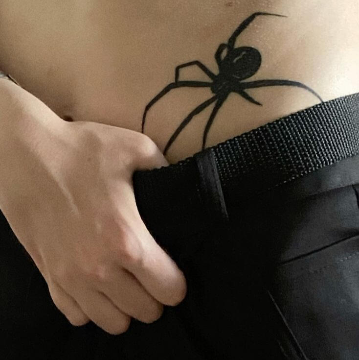 - He also has a big, black spider on his left waist. No particular meaning. He just likes it.